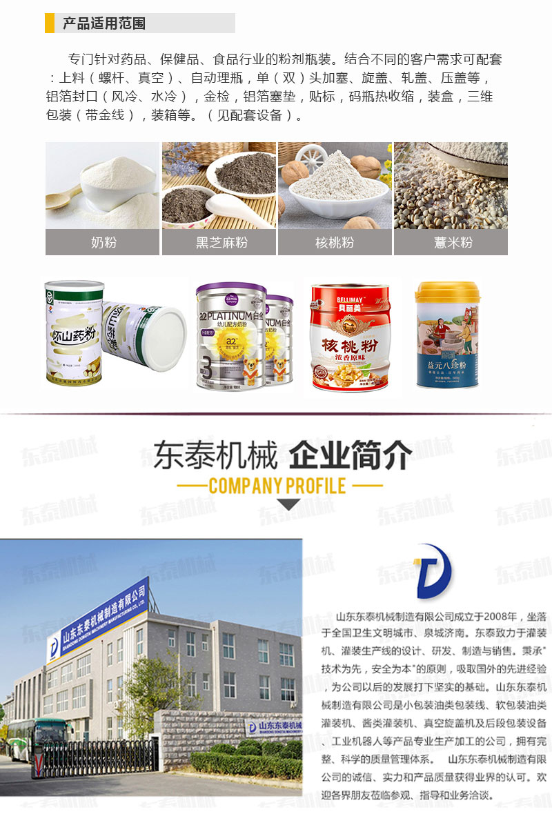 全自動粉劑灌裝機(jī)適用于包裝粉末及小顆粒物料,如粉劑、小顆粒劑藥品、獸藥、葡萄糖、調(diào)味品、固體飲料、碳粉、爽身粉、農(nóng)藥等。