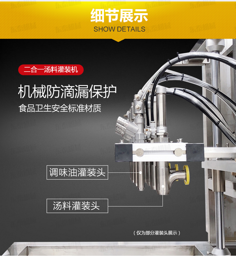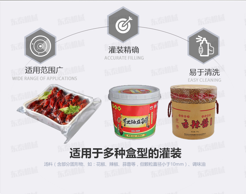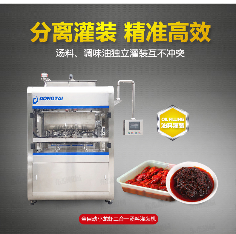 紅油辣椒醬自動(dòng)灌裝機(jī)介紹: 紅油辣椒醬自動(dòng)灌裝機(jī)針對(duì)于調(diào)味小龍蝦深加工行業(yè)的調(diào)味油、湯料的加注,整個(gè)系統(tǒng)為直線式傳送結(jié)構(gòu),湯料、調(diào)味油可在同一臺(tái)設(shè)備上實(shí)現(xiàn)準(zhǔn)確定量,且湯料、調(diào)味油為獨(dú)立的