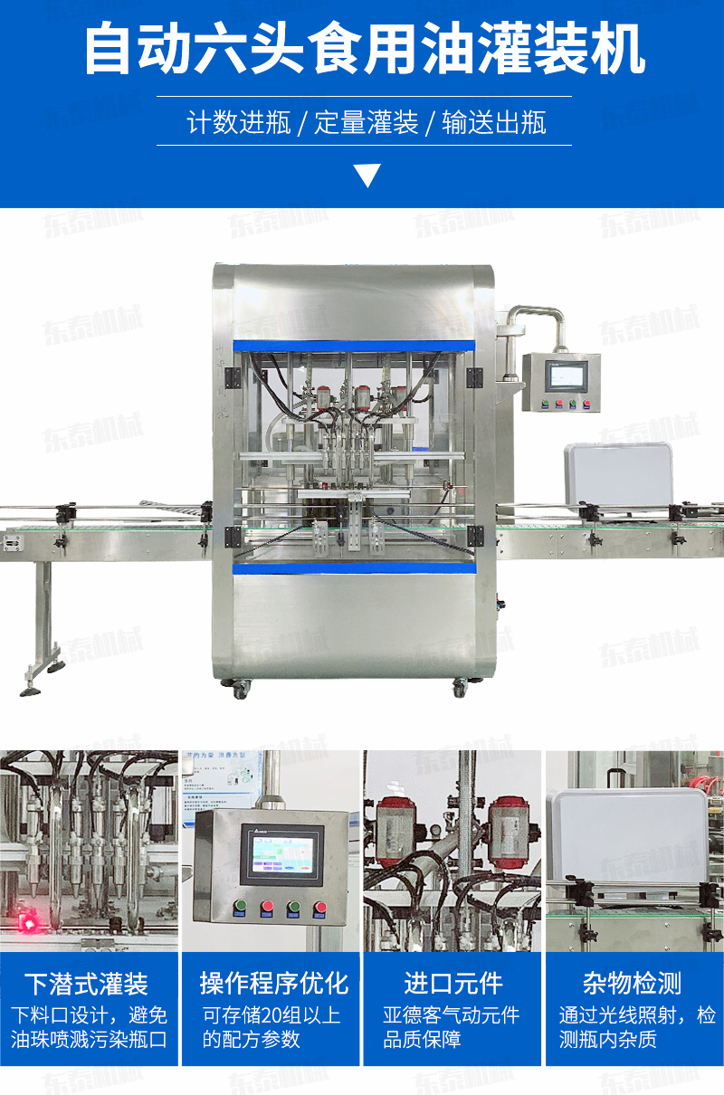 核桃油灌裝旋蓋生產線采用伺服柱塞式計量灌裝原理,適用于各種規(guī)格(0.1-1升可兼顧到2升灌裝)的南瓜籽油、榛子油、牡丹籽油、芝麻油、核桃油、山茶油、亞麻籽油、棉籽油、橄欖油、大豆油、玉米油、菜籽油