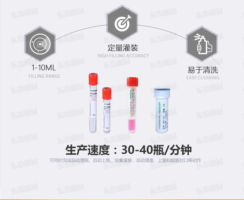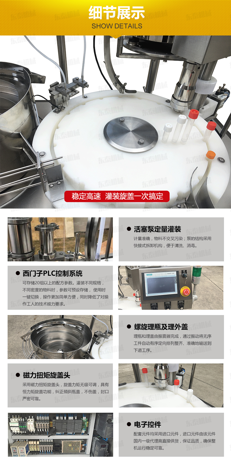 設(shè)備簡介: 本機是在引進和吸收國外技術(shù)的基礎(chǔ)上,由我公司自主研發(fā)的一款I(lǐng)VD診斷試劑灌裝旋蓋一體機,能同時完成自動理瓶、自動上瓶、定量灌裝、自動理蓋、上蓋和旋蓋封口等動作。本機采用日本高