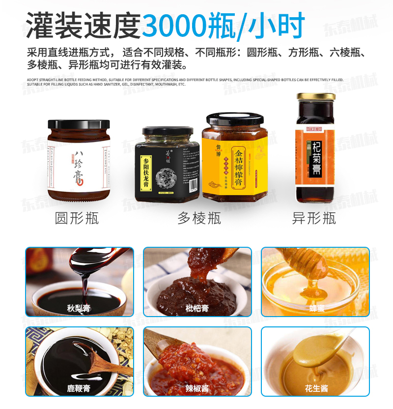 隨著人們對一些產(chǎn)品的質(zhì)量和外觀要求的日益提高,如秋梨膏、蜂蜜、果醬等已不僅僅是簡單的生活用品,如果說給你一個只是簡易包裝后蜂蜜,面對這樣的產(chǎn)品你會買?你會去吃嗎?大部分的消費(fèi)者都是拒絕的吧,因此膏體自動灌裝機(jī)因?yàn)樵龠^程中是做到了全自動化的機(jī)械來操作的人工參與的少,這樣就對于食品而言的話,其銷量效果將會越來越高,如今的膏體自動灌裝機(jī)加工生產(chǎn)流水線因采用動力系統(tǒng)灌裝,我們就不需要進(jìn)行配裝就能夠讓你需要包裝的產(chǎn)品達(dá)到了眼前一亮。